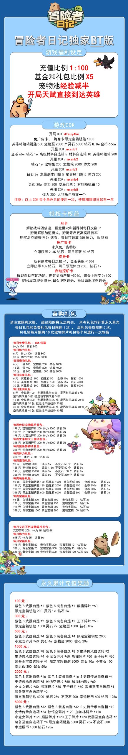 冒险者日记 冒险者日记BT版 基础充值比例:1:1001R=100宝石 上线福利:基金和礼包比例X5上线送免广告卡,终身卡限定宝箱钥匙1000英雄补给箱钥匙500宠物蛋2000个灵石5000钻石8.8w金币666w宠物池经验减半 注册地址:http://110.42.67.219:10012/register/337 双端下载地址1: https://9v1.uk/Nfbq 累充领取链接:http://103.36.165.74:10012/totalReg 注意:链接打不开的请关掉WIFI,复制链接换个浏览器打开,个别地区有IP限制,可以下载“爱加速”换几个节点重试即可 游戏外充链接: 110.42.67.219:10106/voucher 累充领取链接: http://103.36.165.74:10012/totalReg 公测CDK: dfeuy4k6、mxznb1、mxznb2、mxznb3、mxznb4、mxznb5 代金够的前提下可以直接购买游戏里的礼包!不会在跳弹窗! 所以一定要注意别不小心点了不需要的礼包,会直接扣款!如果出现购买了不需要的礼包这个事情技术那边也无法处理!望周知! 代金充值注意事项: 输入自己的账号密码后,若要买游戏外的礼包,切记别填错uid!!!别填错uid!别填错uid!填好后自己检查一下! 怎么查看uid: 进游戏点击自己的头像,用户序号后面那五个数字就是uid!
