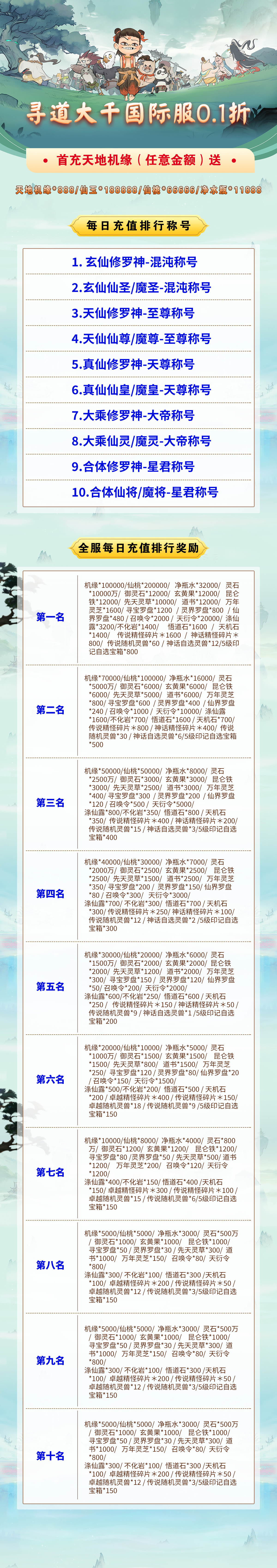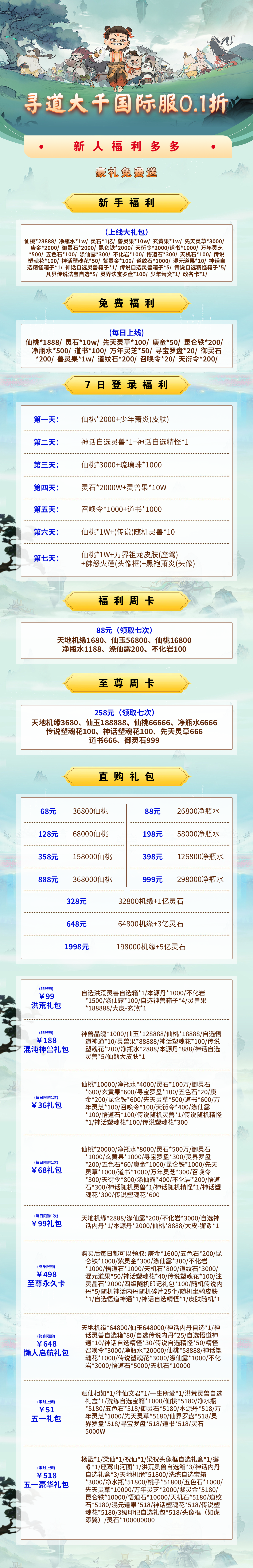 上线福利:仙桃*28888/净瓶水*1w/灵石*1亿/兽灵果*10w/玄黄果*1w/先天灵草*3000/