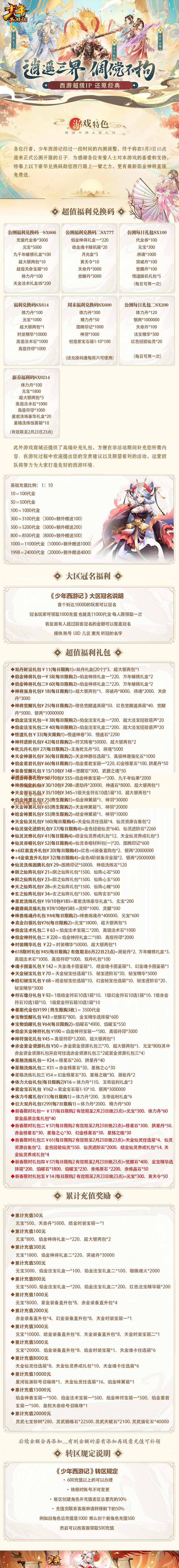 上线福利:充值代金券x3000 元宝x5000 九千年蟠桃礼盒x100 超大银两包x10 超级天命宝箱x10 体力丹x100 天金法术礼盒四x200 焰金神将礼盒一x220 皓金魂卡随机箱x20 月光盒x3 黄天令x10 天命丹x3000 觉醒丹x3000 代金券x100 元宝x300 将魂x1000 突破丹x100 觉醒丹x100 悟道随机礼包x5 体力丹x100 元宝x1000 超大银两包x1 时装精华x10000 高级法术石x1000 高级符印x1000